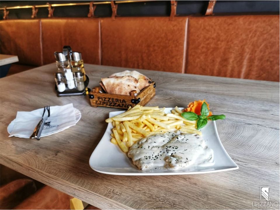 U jelovniku Pizzerije Lipizzano Đakovo nalazi se široka ponuda raznovrsnih jela od kojih izdvajaju veliki broj pizza iz krušne peći. Osim pizza u jelovniku se nalazi ponuda roštilja od svježeg mesa, zdrave obrok salate, morska hrana, talijanska tjestenina, pohana hrana kao i desert palačinke.
